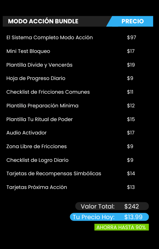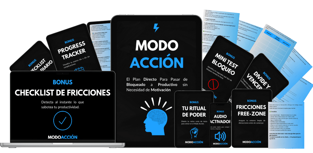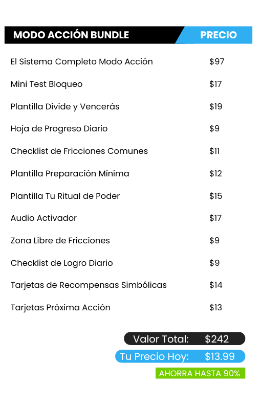 No necesitas disciplina de hierro ni tiempo extra. Solo unas horas para implementarlo y empezar a sentir la diferencia… porque una vez que entras en Modo Acción, ya no volvés al mismo punto de antes.